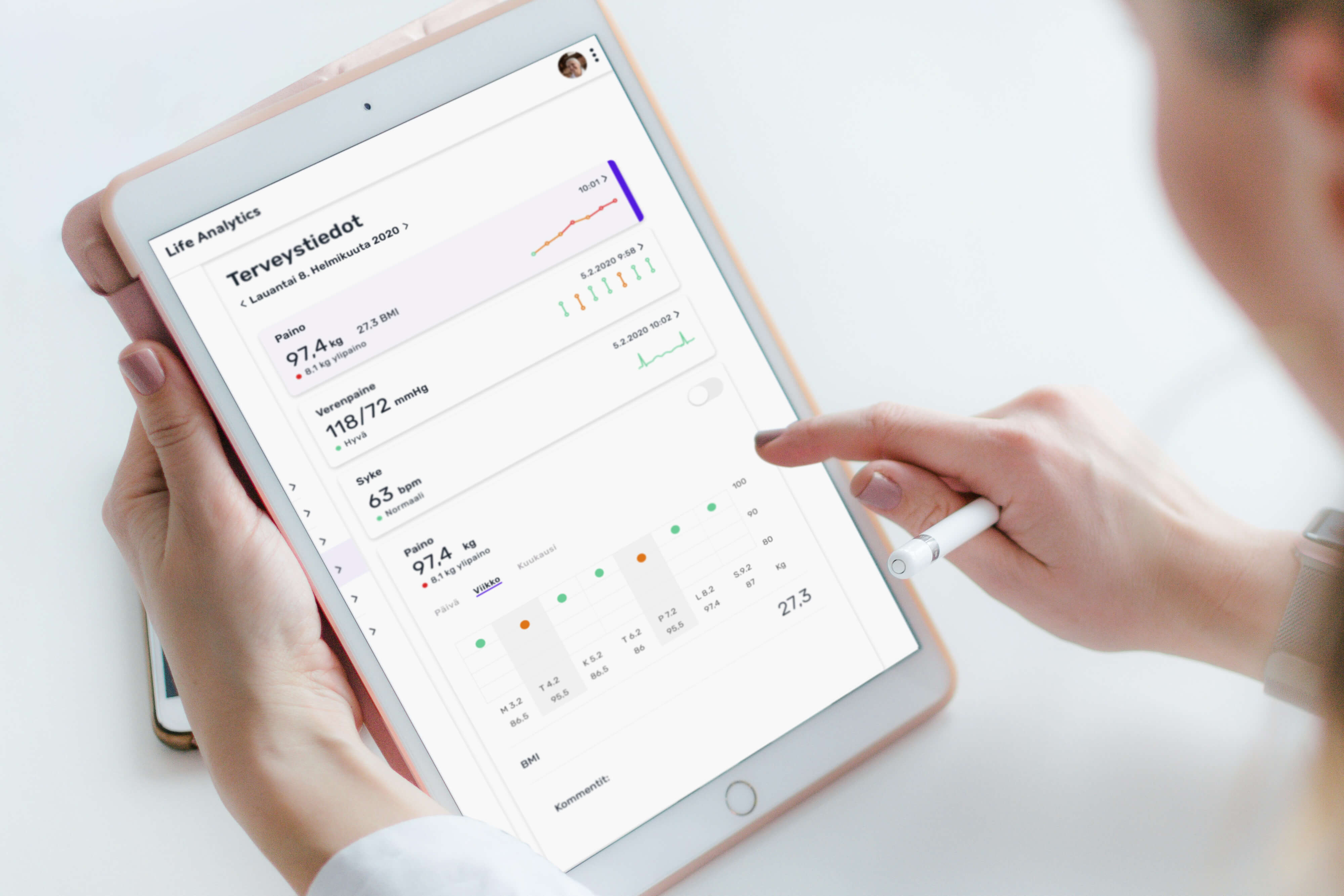 Henkilön painon, verenpaineen, sykkeen, unen ja toimintakyvyn älykäs analysointi.